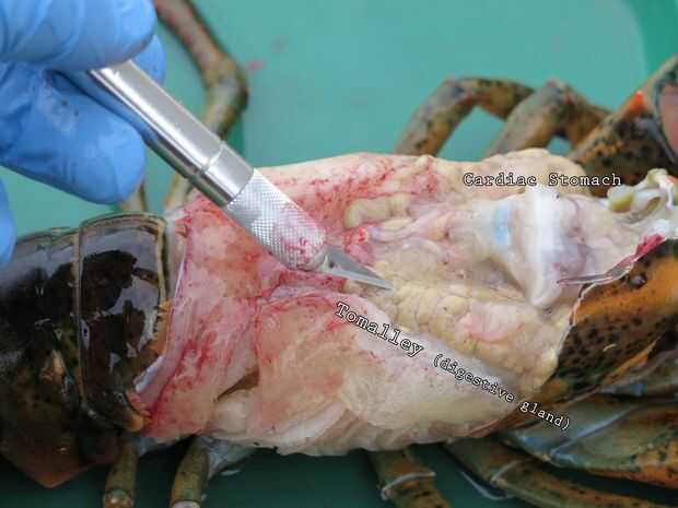 A continuación, quitar más de la parte superior del cefalotórax para revelar tomalley. Este es un gran órgano digestivo verde que ocupa gran parte del interior de la langosta. Cumple la función de un hígado y un páncreas. También se llama "pasta de langosta" y a menudo se considera un manjar. En algunos lugares, puede tener un nivel demasiado alto de toxinas que ingerimos, así que revise su listado local de la FDA.