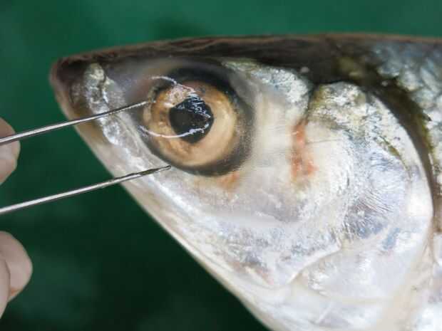 El comienzo natural es mirar en el ojo, que como los estudiantes puede ver no tienen párpados como nosotros (no ¿por qué esto sería?) En el caso de chano, que tienen un párpado adiposo que es una membrana transparente encima del ojo. Si se mira directamente en el centro de la pupila, incluso se puede ver la lente, que es mucho más esférica que la nuestra.