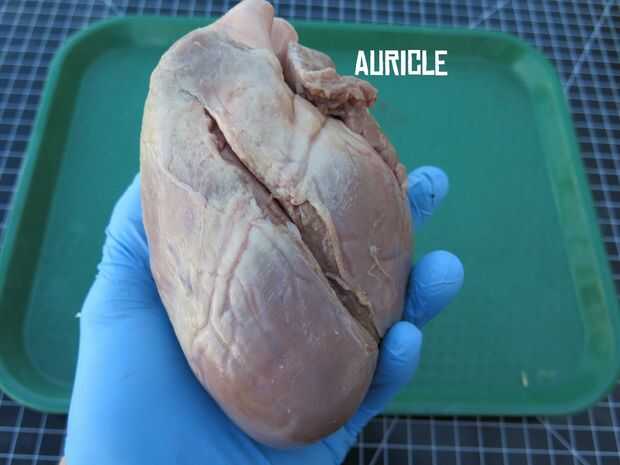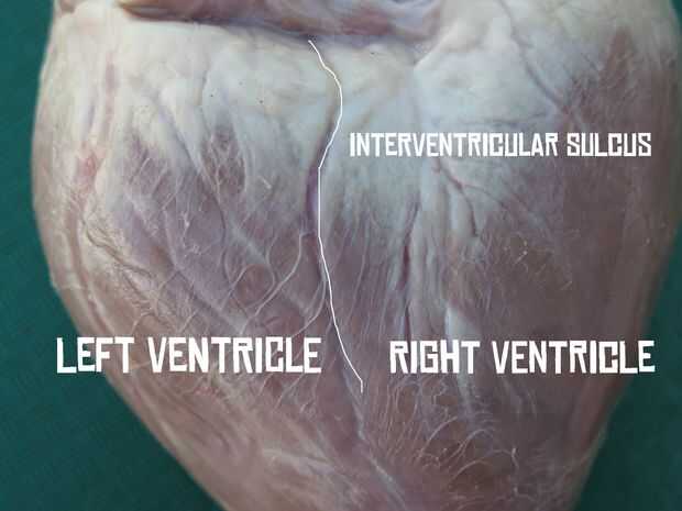 Mirando al frente, usted podría notar una ranura por la mitad del corazón. Este es el surco interventricular. Esto divide los ventrículos, que vamos a llegar en un poco. Si le da la vuelta alrededor, podría encontrar un poco de tejido, colgando como una oreja. Estas son las aurículas, que ayudan a proteger las aurículas dentro.