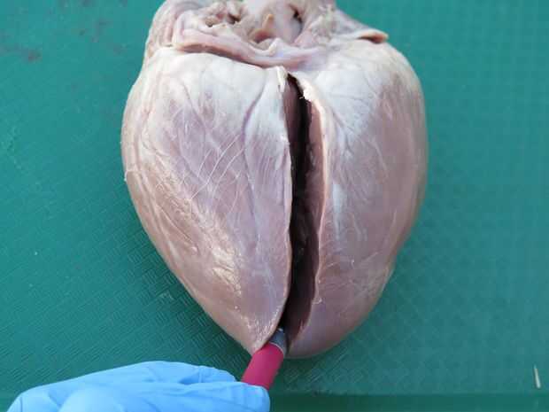 Hay muchas maneras que usted puede cortar su corazón, pero el más informativo tal vez sea directamente hacia abajo la surco interventricular. Encuentre la línea en la parte frontal del corazón y una incisión no demasiado profunda, sólo pasando por la pared superior.