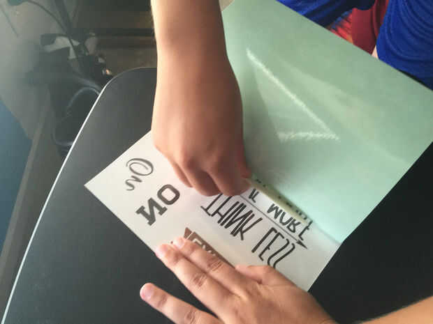 - Una vez el adhesivo sobre el papel, utilice la carpeta de hueso para suavizar el adhesivo y expulsar cualquier burbuja de aire.