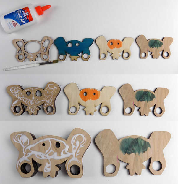 Aplique una capa delgada de pegamento en la parte posterior de la pieza frontal con un pincel. Continuar agregar pegamento a la parte posterior de las piezas y aplicarlos a la siguiente capa hacia abajo.