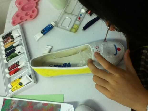 Entonces es el momento para de color con pintura acrílica. Asegúrese de que ha preparado el tamaño correcto de cepillo de pintura, por lo que será más fácil para usted pintar tu diseño. Utilice la paleta así que usted puede mezclar algunos colores que desee. Limpie el pincel con el agua de la taza cuando desea utilizar el mismo pincel, pero con un color diferente. No utilice mucho en el zapato de la pintura o tardará más tiempo para secar. Solo pintarlo un poco.
