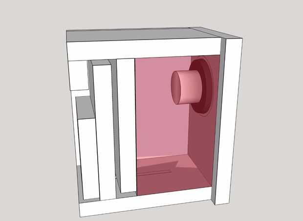 Diseño de caja resonante volumen primero, eligió una altura y anchura de la cara frontal en una relación agradable y calcula la longitud en función del volumen que necesitaba. Arbitrariamente, la parte delantera es 5 "x 8,09" con un agujero de 3.1" centrado 2,5" de la parte superior. Porque estoy usando. 75" MDF entonces mi dimensiones internas eficaces son 3,5" x 6,59"(realmente 3,42" x 6,51" ya colocaré. 04" acústico cubierta internamente por todos lados) es mi volumen total necesario 83,04" el resultado es la longitud de la caja interna 3,810". (He añadido el grueso de la acústica láminas x2 a la longitud así).