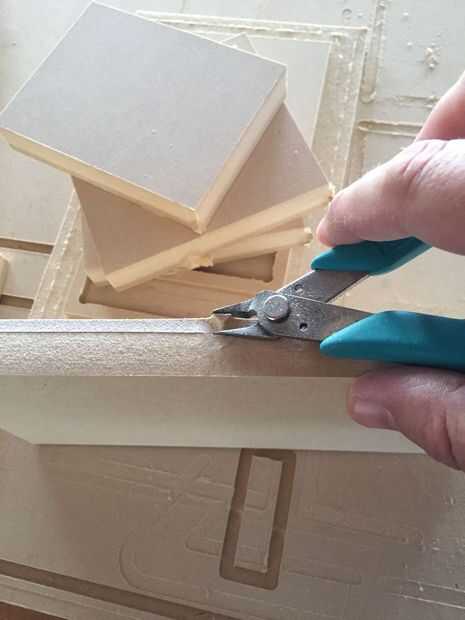 Para cada parte Quite la lengüeta con papel de lija o pinzas de corte al ras. Yo Lije ligeramente los bordes del MDF donde podría haber un poco rasgón hacia fuera de la ruta. Soplar el polvo sin respiración en, y luego le puse las piezas de sujeción, ligeramente para ver cómo se va a ver. Cuando esté satisfecho, romper el compresor de aire, pistola de clavos, pegamento para madera y resto de las pinzas de acabado.