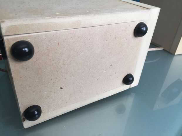 Me gusta el look de MDF bricolaje, pero tengo algunas ideas para futuros juegos. Tengo una selección de las muestras de chapa de madera, y traté de barnizado de una pieza de MDF. Incluso un trozo de madera dura para ir en la parte frontal sería un final agradable. Pongo los pies de goma en la parte inferior. A mi me funciono la prueba de concepto, pero antes te digo cómo suenan, aquí es qué haría diferente.