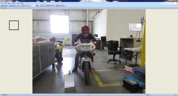 Se puede estimar el área frontal de su motocicleta por usted mismo fotografiar en la moto junto a algo de tamaño conocido, utilicé un trozo de papel. Luego abra la foto en paint y dividir su cuerpo en aproximaciones cuadrados. Luego abrir la imagen en el editor de imágenes de Microsoft Office y resaltar las secciones cuadradas para obtener una estimación del número de píxeles de la zona. Comparando esto a la zona de la pieza de trabajo puede obtener una buena aproximación de su área frontal.