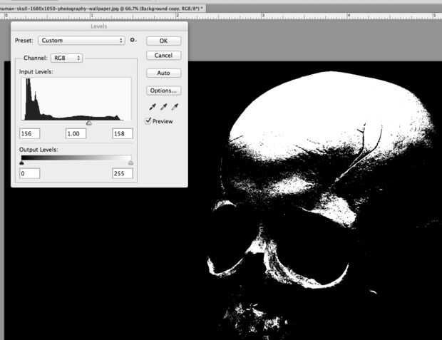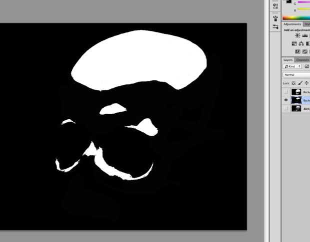 Ahora seleccione la capa media y hacer lo mismo, pero mover las flechas más derecha en el histograma. Esto aísla los puntos más brillantes. Juega con él hasta que usted es feliz y haga clic en "Aceptar". Sin embargo, recuerda que vas a cortar completamente a través de la calabaza para hacer estas formas, así que asegúrese de que cada forma es un "agujero" y no un "donut". En otras palabras, el blanco no debe rodear negro en cualquier parte de su capa excepto donde vas a editar, en la etapa de limpieza.