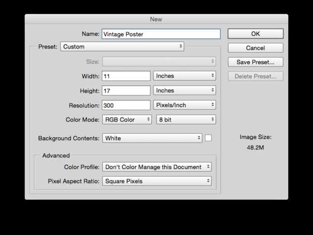 Puesto que vamos a imprimir este cartel en algún lugar, vamos a empezar con un tamaño estándar de 11 "x 17". Vamos a usar un modo de color del RGB ya funciona mejor con las acciones de Filmtastic.