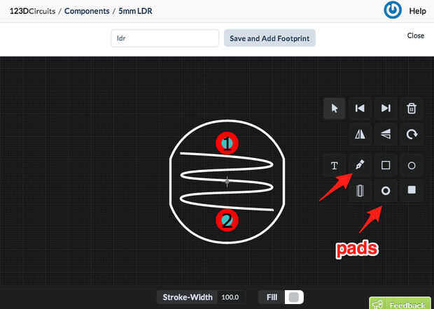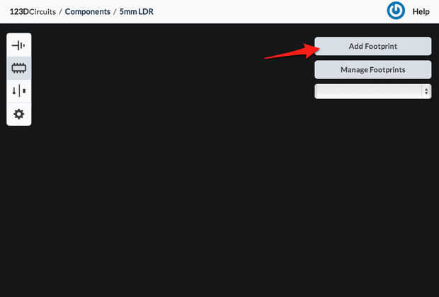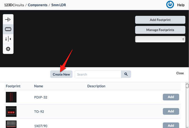 Abrir la vista de la huella y haz click en "Añadir la huella". Aquí otra vez usted puede seleccionar uno de una gran colección de huellas estándar de la industria (que se puede editar y la horquilla) o crear uno nuevo. Vamos a crear una nueva para este instructable: haga clic en "Crear nuevo"