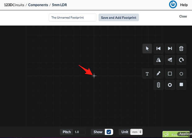 Haga clic en la Cruz en el medio para cambiar el tono de la rejilla de snap. Agregar cojines y serigrafía utilizando las diferentes herramientas. Apoyamos pads SMD y a través de filtros de agujero.
