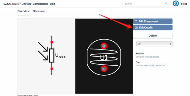 Cuando termine, volver a la página de componente haciendo clic en el título del componente. Ahora puede marcar el componente. Ahora está disponible en el editor de circuitos para utilizar en su diseño. Haciendo esto también contará con el componente en la galería para que otros usuarios pueden utilizarlo.