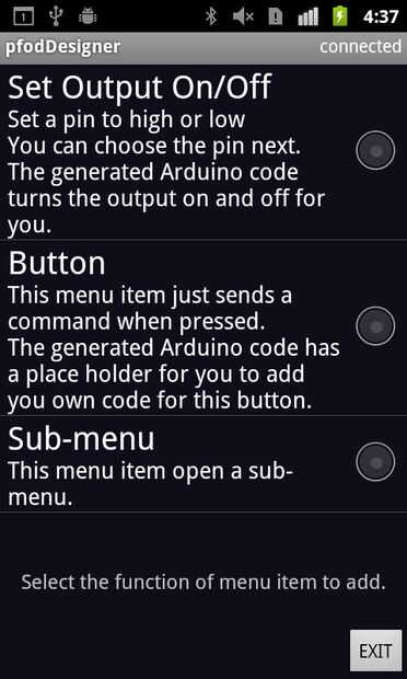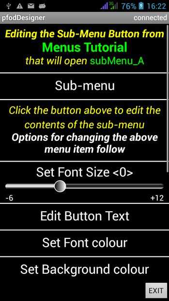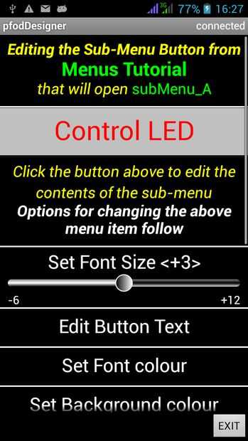 La pantalla de arriba es la pantalla de edición para el botón que aparecerá en el menú principal. Cambiar el texto de botón de "Menú" "LED de Control" y configurar cualquier tamaño de fuente, color y color de fondo que te gusta.