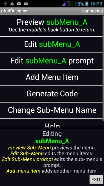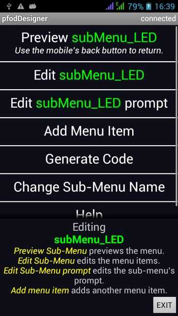 Para ayudarle a hacer un seguimiento de que está trabajando con el menú, es una buena idea para "Cambiar nombre del menú" algo reconocible, decir "LED". El pfodDesigner siempre pone 'subMenu_' frente a todos los nombres de menú. Como el nombre del menú, submenú nombres no se muestran al usuario pfodApp. Sólo se muestran en pfodDesigner y utilizar en comentarios de código.