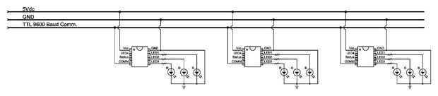 En este diseño de Junta, realmente quería probar la idea de enviar energía y comunicación sobre los mismos dos cables. Si comm errores fueron ignoradas, se requiere sólo dos cables. Eso es solo abajo derecha cool! Mientras que el envío de comunicaciones sobre los cables de alimentación es cool, no es necesario. Todas las lámparas pueden conectarse un cable comm solo si lo desea. Esto significaría que cada lámpara requeriría tres cables con un alambre de estado cuarto de retroalimentación opcional. Ver el diagrama abajo.