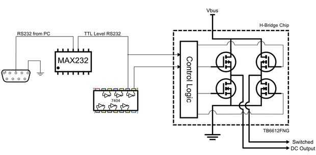 Para enviar comandos a la tarjeta utilicé simple 9600 baudios mensajes desde un programa Python. La materia prima venida de RS232 de la PC se convierte en TTL usando un chip MAX232. La señal RS232 TTL va al entrada de control de puente en H. El RS232 TTL también pasa por una puerta del inversor en un chip 74HC04. El RS232 invertido entonces va a la otra entrada de control de puente en H. Por lo tanto, ningún tráfico de RS232, el puente H salidas 6 voltios. Para cada bit de la RS232, el puente H cambia la polaridad a v-6 para como RS232 bit dura. Ver las fotos del diagrama de bloque abajo. También se adjunta el programa de Python.