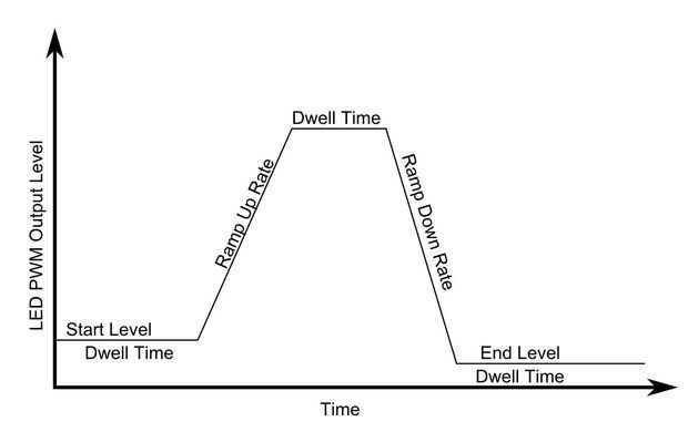 Un perfil LED consiste en un nivel de inicio, comienzo habitan tiempo, rampa, tiempo de detención superior, nivel superior, rampa de bajada tasa, de nivel inferior. Ver la figura adjunta. Wow, eso es mucho para un LED. Ahora, multiplicar eso por el número de LEDs. Se convierte en demasiado - podría solamente hacer un seguimiento de tres LEDs con perfiles de rampa completo. La cuarta (LED blanco en el tablero de dev) sólo tiene rampa de capacidad. Es un compromiso. Echar un vistazo a la foto adjunta de un perfil de rampa.