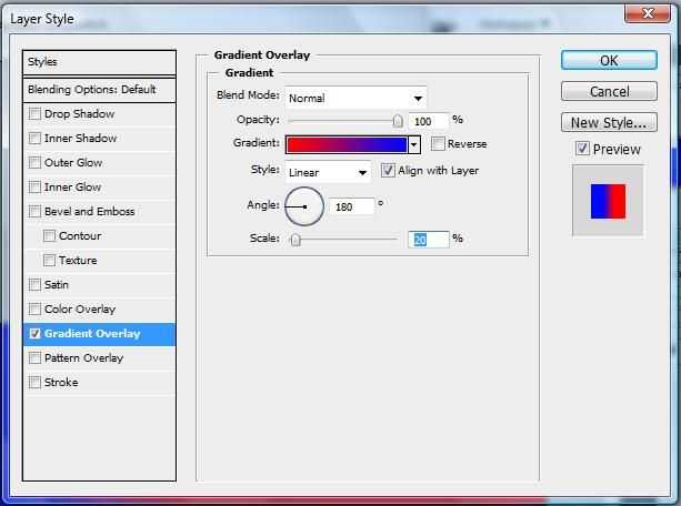 5. Haga clic en "OK" hasta llegar nuevamente a la pantalla de "Estilo de capa". Alinee el degradado para que se ejecute en todos los ámbitos. Si usted está siguiendo este tutorial, palabra por palabra, debe ser 180 grados (11). 12) ajustar la escala en grados de 20% en mi caso. Si es 100%, no habrá ningún color que es lo mismo, hasta la extrema izquierda o extrema derecha. Mueva la barra alrededor y ver lo que hace. 13) haga clic en "OK"