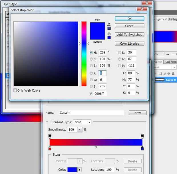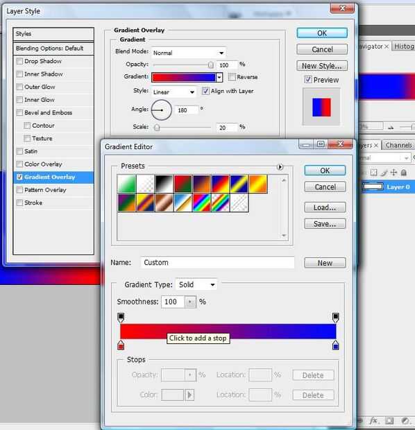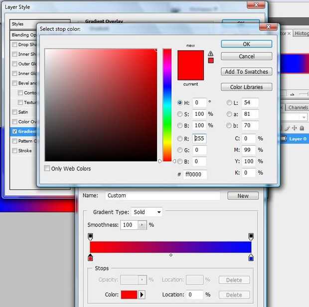 2. 3) haga doble clic en "Capa 0" y buscar "Superposición de degradado" y haga clic en él (4). 5) haga clic en el espectro de color donde dice "Degradado"