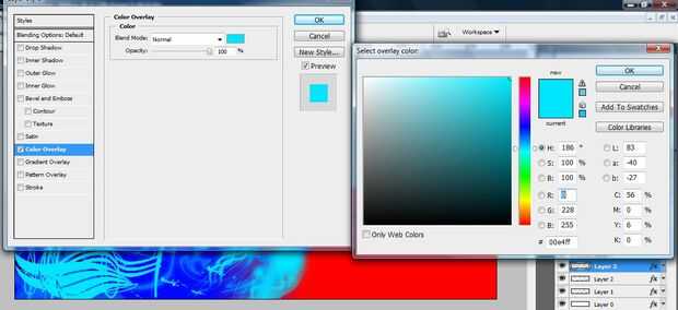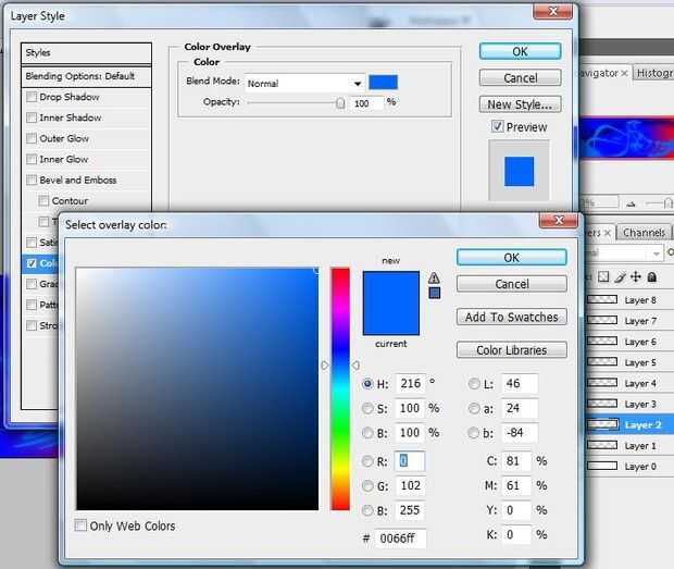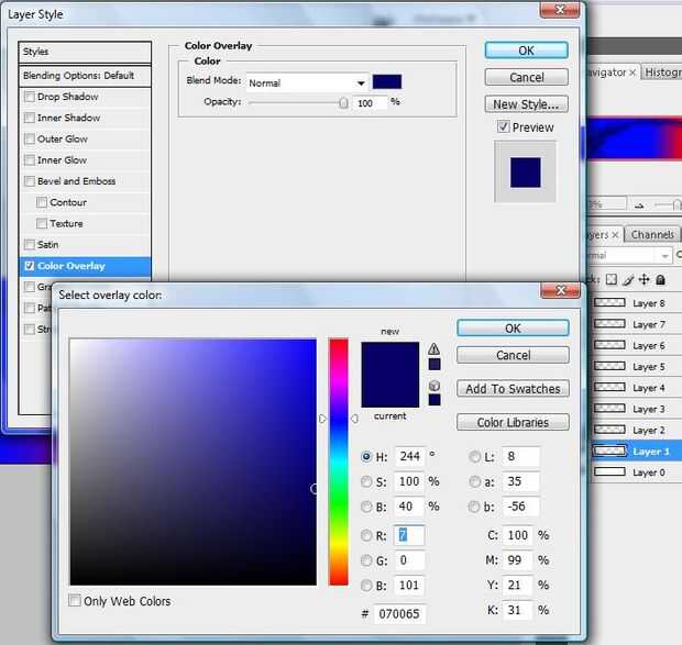 7. 11) haga doble clic en "Capa 1" y 12) haga clic en "Color Overlay". 13) Ahora haga clic en el color para abrir un cuadro familiar (14). Elige tu color, que sea oscuro y haga clic en "OK" y "Está bien" otra vez (15) para guardar el estilo de capa.