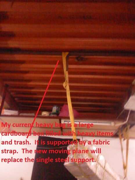 Ver la parte superior de mi saco con el apoyo de la línea central. Tiene una conexión de soporte solo para el acero del hierro de ángulo cerca del techo. Esto se sustituirán con dos soportes de metal, que mantienen la vía guía linear dual que se muestra en el paso anterior.