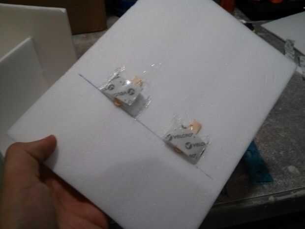 Pegué en las tiras de velcro en una cubierta levantada del fuselaje que sostenga las pilas en su lugar.