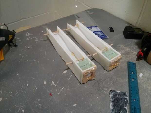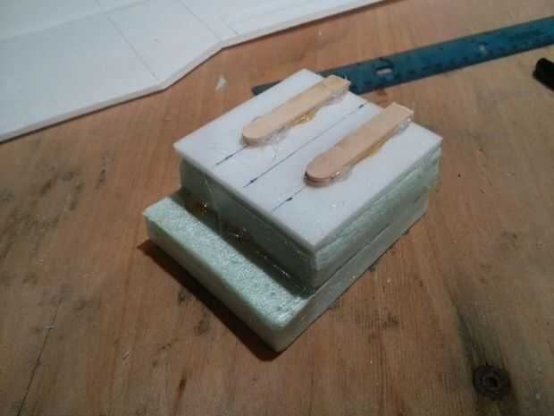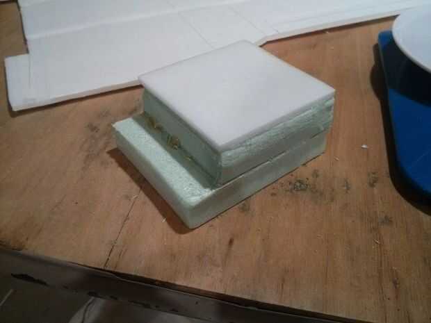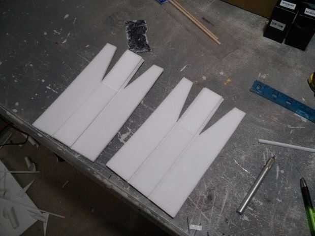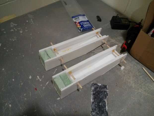 1: Pegar 2 piezas de espuma de aislamiento (la espuma gruesa de verde o azul en las ferreterías) que se cortan para caber dentro del fuselaje (rozando el fondo y los lados del fuselaje), juntos.