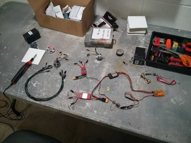 Para este plano, usé 2 motores que proporcionan aproximadamente 860g de empuje con una hélice 10x4.7 (1720g total) y dibujar sobre cada 12Amps. (Información / hélice recomendada encontrados en el sitio web de fabricantes de automóviles). Usando esta ecuación, (tiempo de vuelo (min) = capacidad de la batería (Ah) / Motor Draw(Amperes)*48) Amp que toma en cuenta la regla del 80% de sólo descarga las baterías 80% de su capacidad. Descubrí que con un 2200mAh (2.2Ah) batería, podría conseguir 8,8 min de tiempo de vuelo por motor. Así, en total, tengo dos 2200mAh baterías a bordo. Entonces elegí una ESC de 40amp (que es absolutamente excesiva, que sólo necesitaba un ESC 25-30Amp, pero quería que la temperatura de funcionamiento) para cada motor.