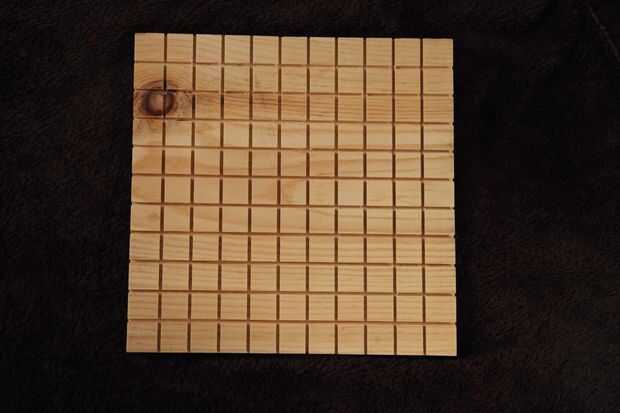 Entonces para mi tablero de tamaño 11 x 11, empecé cortando un trozo de tabla de pino de 1 "x 12" a 11 "x 11". Cortan muescas a intervalos de 1" tanto horizontal como verticalmente a través del tablero. Hice las ranuras 1/4" de grosor y anchura de la hoja. Usted podría parar aquí si lo desea. Es un tablero de juego perfectamente aceptable como es. Pero ya que he sido querer tratar de incrustación de madera, me decidí a rellenar estos surcos con un tipo diferente de la madera.