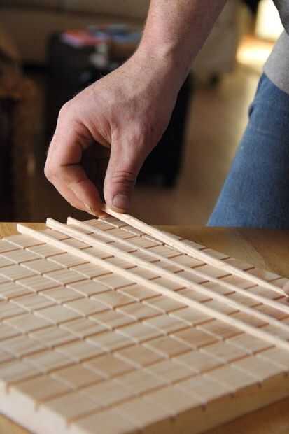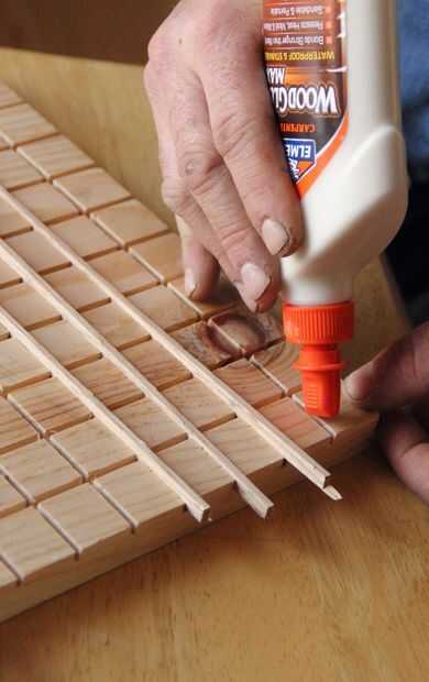 Una vez que tienes suficiente cortar para una dirección, seco-cupo les en lugar para asegurar que te encajan antes de que pegue. Entonces aplique una tira de pegamento para madera en cada ranura seguido por las tiras que has hecho. Ahora hice mis tiras más altas que las ranuras con la intención de cepillado/lijarles plano más adelante. Después de presionar tus franjas firmemente en las ranuras, limpie el exceso de pegamento del tablero con un trapo limpio.