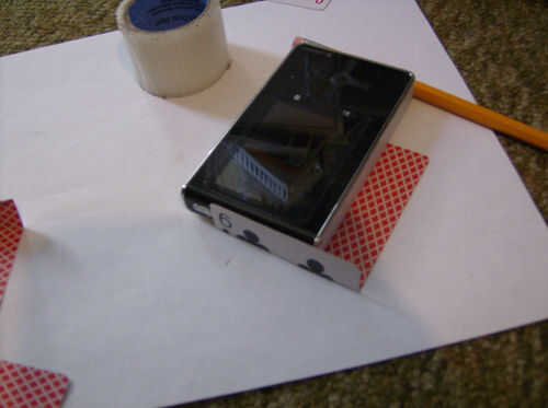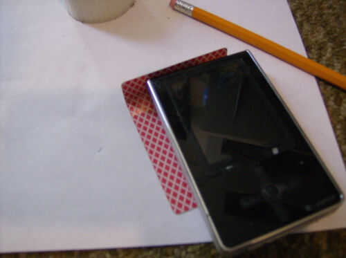 Primero tendrás una pieza trasera que cubre también la parte superior de su reproductor de MP3. Esto va a ser doblado mucho. Mi reproductor de MP3 fue sobre el mismo ancho que la tarjeta que juega, así que esto era fácil. Si vas a hacer uno algo diferente, tenga mucho cuidado corte la tarjeta.