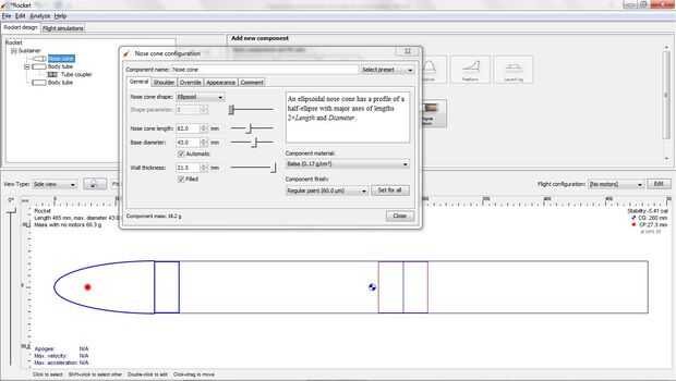 Ahora haga clic en el botón cono de nariz. Um, lo que, la nariz no puede ir en la parte posterior. Está bien, sólo cierre la ventana de propiedades de nc y haga clic en el botón "subir" hasta que quede donde debe estar. Haciendo doble clic en la cualquier nc CN o sí mismo en la lista de la izquierda. Ahora podemos configurar nuestras propiedades. Bajo material desplazarse hacia arriba y balsa seleccione y haga clic en el botón de llenado hacia la izquierda. Después de seleccionar la forma de nc que desee, yo recomendaría un elipsoide para comenzar con. Siguiente ir a la ficha de hombro establece el tamaño de los hombros, el diámetro debe ser el mismo que el id de la BT al ajustar el espesor del hombro situado a mitad del diámetro ya que es una pieza sólida.