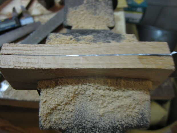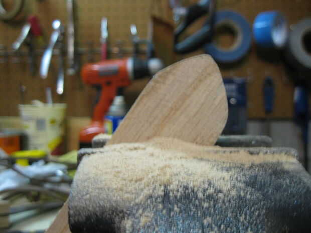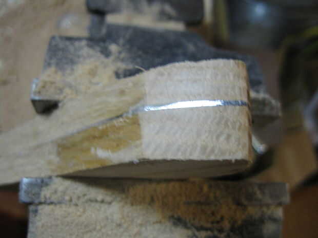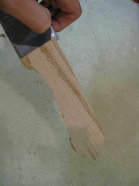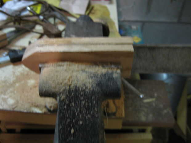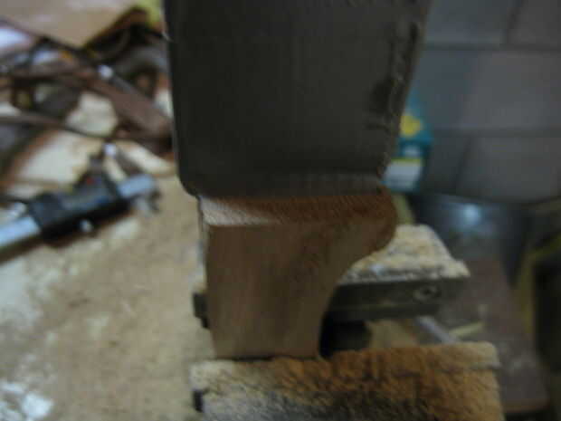 Ahora para la parte más larga y tediosa: formar áspero. Similar al pulido, esto es donde el mango se ve más como un mango y menos como un bloque de madera. Esta etapa requiere una percepción de poco, ya que usted quiere saber donde empieza el metal. Golpear el metal con una escofina de madera hace que sea más opaco. La idea básica detrás de esto es utilizar la escofina hasta que crees que está cerca de metal, luego cambia a un archivo que puede ocuparse de metal y madera. Esta parte es bastante tediosa, pero quiere tomarse su tiempo. Las imágenes muestran el esquema básico tomando forma, que es lo que quieres en este momento. Además, puede cubrir la lámina con cinta adhesiva para fijarlo con la abrazadera en el tornillo de banco y trabajar en el mango entero.