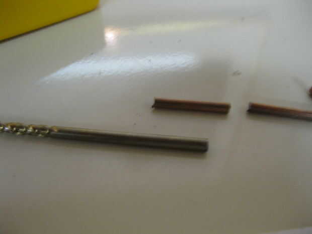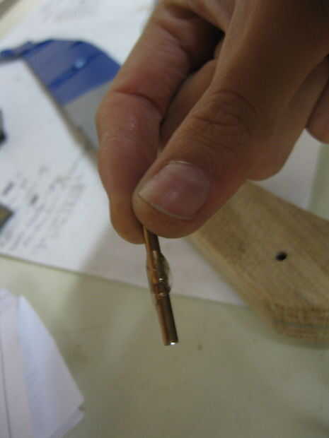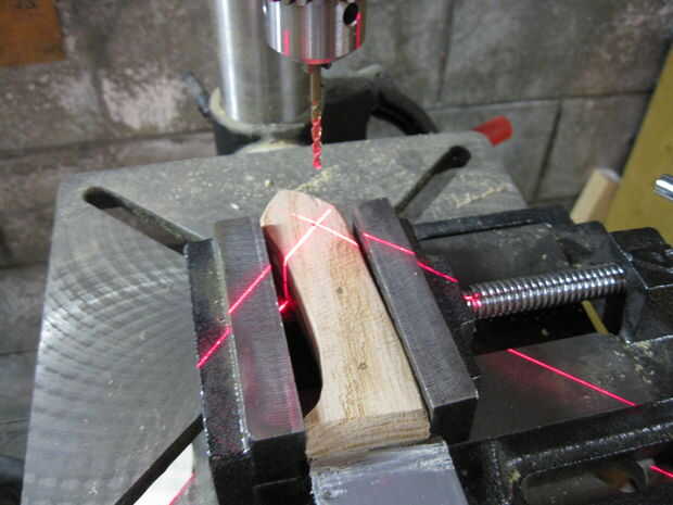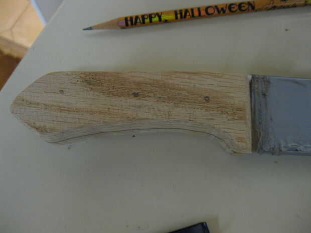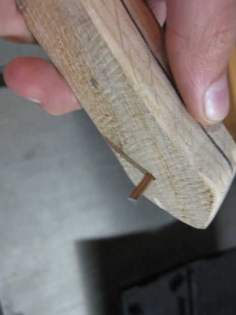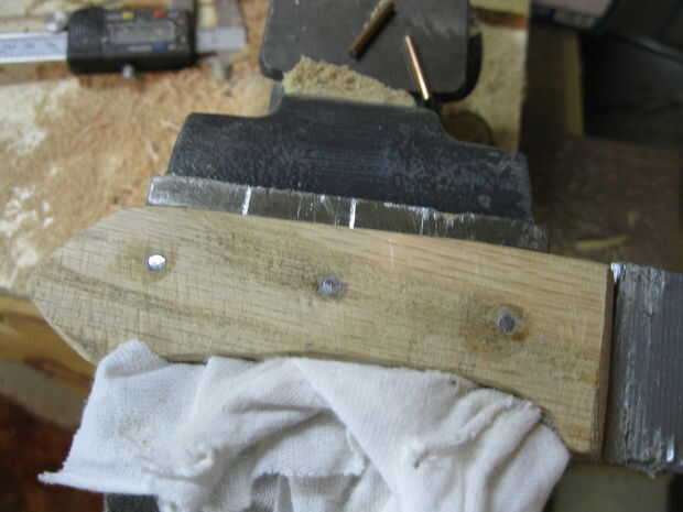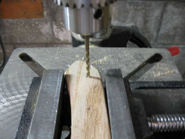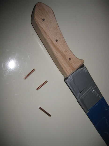 Ya instale las clavijas va con acabado final, voy a incluir todo en un solo paso. Ya que no tengo ningún lujo remaches y tal uso un método que puede parecer como engaño a algunos fabricantes del cuchillo hardcore: Taladre a través de la manija y la lámina, las clavijas de la de epoxy y presentarlos planos. El primer paso en este proceso está marcando los agujeros. Generalmente las marcas de la globo ocular, entonces Compruebe su orientación con una regla para asegurarse de que todos ellos se alinean. A continuación, desea medir y cortar sus pernos. Para este cuchillo sólo usé una barra de cobre amarillo (puede ser una varilla de soldadura). Para medir, sólo los ponen en el mango y marcar con un rotulador. Hacen un poco grandes aunque. Es mucho más fácil de quitar material de lo que es para añadirlo. Sujetar la varilla en un tornillo de banco y utilice una sierra para metales ordinario para cortar las patillas. Entonces es la prensa del taladro! Fije su pieza bien de alguna manera, luego perfore a través de todo en uno. Puse el taladro en su velocidad más baja y utilizar una broca muy afilada. Repita con el sin embargo muchos pernos que desea. Cuando termine, hacer seguro de doble cheque el ajuste de los pernos en los agujeros. Si apenas se ajustan, entonces estás de suerte! Sólo les golpee con un mazo y un archivo de los extremos. Si desliza fácilmente, entonces su tiempo de epoxi! Mezclar algunos epoxy más, luego poner un poco en el centro del perno. Resbálelo adentro y limpie cualquier exceso de epoxy con un trapo limpio. dejar que se seque antes de presentar. Cuando esté seco, sólo presentar los pasadores al ras utilizando un archivo de molino.