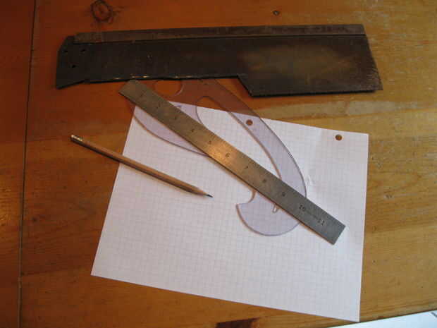 El primer paso en la fabricación de la mayoría de las cosas es un diseño y lo mismo ocurre para cuchillos. Para el diseño de mis cuchillos, utilizar papel cuadriculado, regla de metal, una curva francesa y un lápiz normal. También, desde que uso metal encontrado para mis cuchillos, me gustaria tener el metal delante de mí, así que sé lo que tengo que trabajar con.