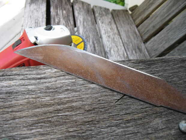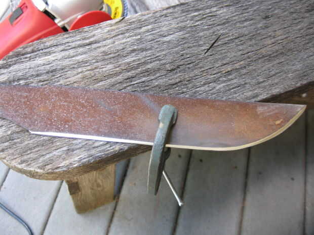 Para formar el bisel uso un disco de 36 grano para mi amoladora de ángulo, ya que tiene una trayectoria de corte amplio. Mientras se forma, comprobar el ángulo mirando hacia abajo el espacio en blanco. Al golpear a mitad de camino, dale la vuelta y moler el otro lado. Cuando vea un borde de alambre conformado, detener. han hecho un éxito borde.