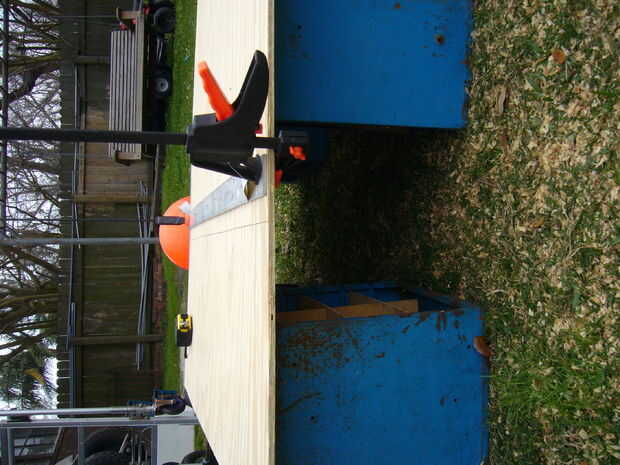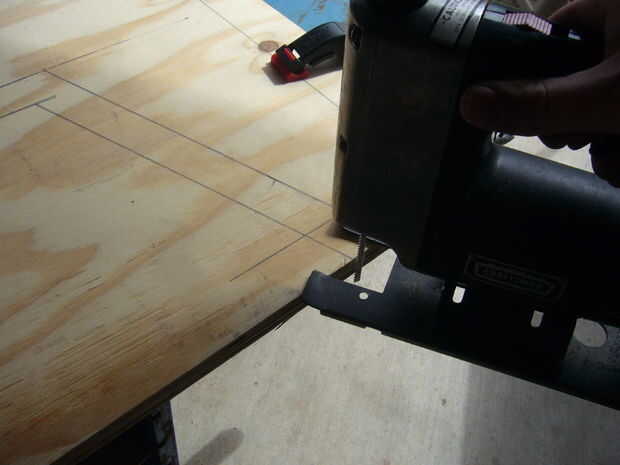 Ahora que todas mis líneas de referencia han sido marcados, era hora de cortar. No tener a mano cualquier caballetes construido pero tengo algunas cajas metálicas que harían el truco. Me aseguré que no iba a cortar cualquier material otros entonces el .clamped de madera de capas mi plaza de yeso en lugar (considerar el ancho de la Guía Sierra) .entonces lentamente y con precisión cada uno de mis cortes