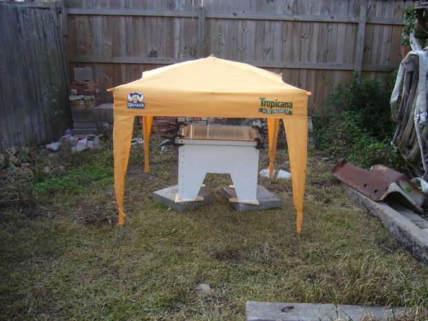 Ya que esta forma sería hacia fuera en el tiempo por varios meses, yo sabía que necesitaba para cubrir de alguna manera. Le pregunté a mi papá (que normalmente tiene cualquier cosa que pueda necesitar) si tenía un toldo plegable y de grueso ya que necesitaba uno, no so planeaba en la construcción de una vivienda pequeña sobre las hormigas .un algunos días más tarde mi papá vino en y le preguntó si aún necesitaba el toldo porque él había conseguido uno para mí en una venta de garaje .it es cerca de 5 x 5 pies y cuando las piernas no son completamente lo construido a se encuentra cerca de 2 a 3 pies sobre la forma que era perfecto
