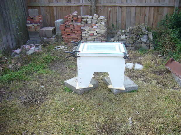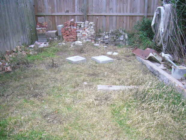 Una vez que tenía la hierba y las malas hierbas cuidado trasladó dos bloques de hormigón (mi padre había hecho por lo que sea) en lugar para que la forma sería arriba de los bloques de hormigón de tierra .el no fueron lo suficientemente amplia como para abarcar la distancia que necesitaba así que puse cada uno en una diagonal .y resultó para ser sólo lo suficientemente amplia como para mantener la forma