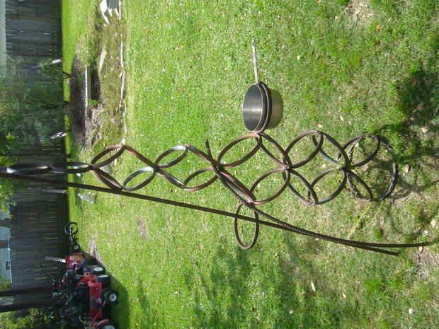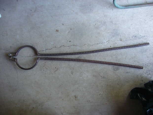 Había encontrado un agarrador de flores, alguien se lanza y a la vez lo recogí no tenía ningún uso para él pero sabía iba a venir en práctico .it se compone de estos anillos de metal creo que eran una especie de sellos de válvula usado en refinerías (que me rodean) pero lo que inicialmente eran destinados a habían sido soldada con autógena juntos en la estructura foto abajo .con uno de los anillos , algunas barras y algo de tipo grillo encontré a lo largo de la pista del ferrocarril. Tuve lo que necesitaba para hacer mi crisol abrazadera