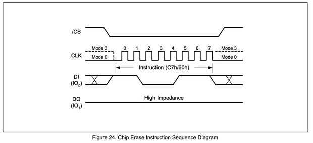 Para hablar a cualquier dispositivo SPI, es chip-select debe ser traído alto y luego impulsada por la baja (recuerda /CS significa bajo activo). Cuando /CS es baja, tenga en cuenta que el reloj en el diagrama se dibuja muy explícitamente para mostrar ocho fases. Esto significa que usted debe de pulso el reloj ocho veces, una vez por poco. En el momento que el reloj es el efecto estroboscópico, datos en va de alto a bajo a alto. Creo que el diagrama de DI es erróneo, porque si dibuje una línea vertical el flanco ascendente de cada reloj y calcular los valores binarios de DI en esos puntos, usted debe obtener valor 11000111 o 0xC7. Esta es la instrucción que le dice el chip para borrar a sí mismo. Una vez que alto se trae chip select, la circuitería interna comenzará ejecutando la función de borrado de 0xC7 y virutas. Esta instrucción toma aproximadamente 1 ~ 2 segundos para completar.
