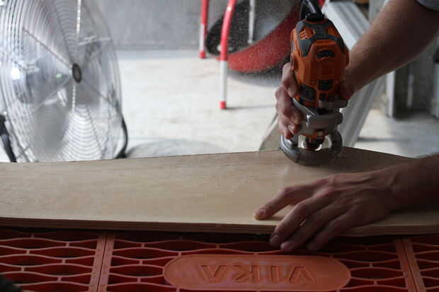 Con 7 capas de chapa, esta placa termina justo por debajo de 1/2" de espesor total. Vamos a utilizar un 1/4" redondo en poco en los lados superior e inferior de la Junta para lograr un borde totalmente redondeado. Los bordes ásperos se lija suave en una etapa posterior.