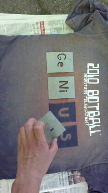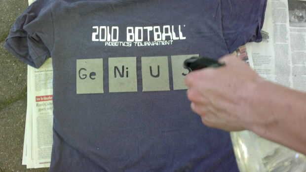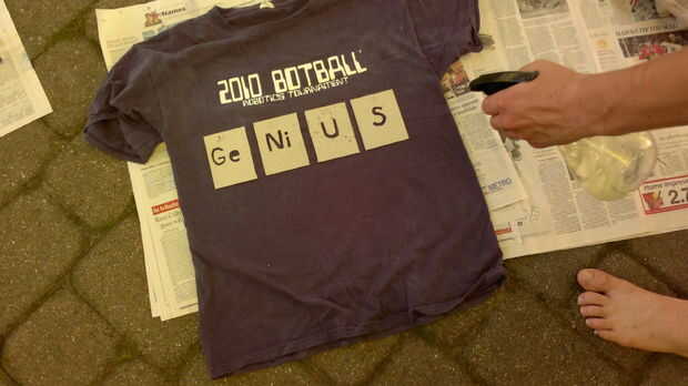 Rociar abundantemente la camiseta con lejía. Desea que la botella de spray para crear una niebla fina. Si usted sólo rocíe sobre y cerca de la cartulina, entonces creará un degradado de color.
