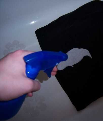 Rocíe un 2/3 agua, solución blanqueadora de 1/3 en la camiseta. El más lejos el miniaturizan parecerá. Mina de cerca de 2, 3 pies lejos de la camisa.