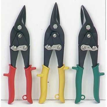 I. compuesto acción Cizallas / tijeras de aviación: utilizado originalmente para hacer aviones, estos son fáciles de usar debido a su acción compuesto, produciendo una mayor ventaja mecánica. Son codificados por colores, aunque todo lo que realmente tienes que hacer es mirar las mordazas y use su sentido común. Amarillo es recto, queda rojo, el verde es correcta. Tijeras de aviación de largo-corte la mandíbula ángulo de 90 grados de las manijas y buenos para hacer tiempo, cortes rectos donde la separación de materiales es un problema.
