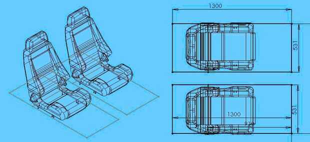 En www.3dcontentcentral.com (un recurso gratis para dibujos CAD 3D) es un modelo de asiento de coche para SolidWorks. Con este modelo y los datos disponibles de la literatura un nuevo modelo fue hecho en SolidWorks, el modelo del supuesto espacio prohibido. Este es un modelo con un diseño de la silla y el espacio que se necesita para el conductor y el pasajero: este espacio no se puede utilizar para la estructura.