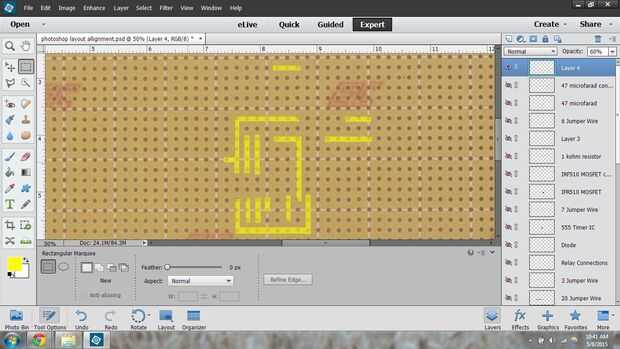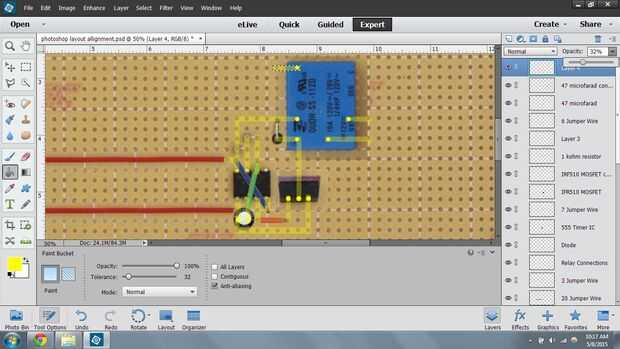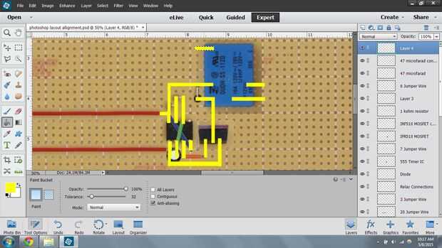 Para mostrar donde estarán las conexiones, utilice la herramienta "Selección" para seleccionar el área entre los terminales que se conectarán. Utilizar la herramienta de "Relleno" para rellenar esta área con un color sólido. Estableciendo la "opacidad" de la capa de conexiones al 50% o menos, usted hará que las líneas de conexión transparente y usted todavía será capaz de ver las partes que se solapan.