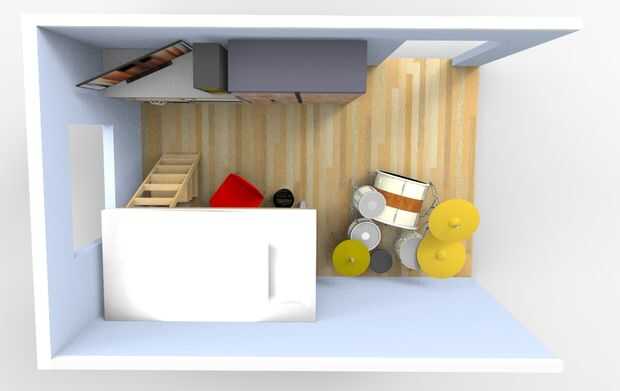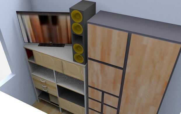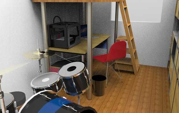 no me gusta las habitaciones grandes, así que diseñé un realmente pequeño. Todo lo que pude necesito tiene: configuración de batería, computadora, impresora 3D, TV, altavoces y un montón de espacio de almacenamiento. Realmente traté de maximizar la utilización de cada rincón, dejando todavía espacio para colgar ilustraciones y bocetos.