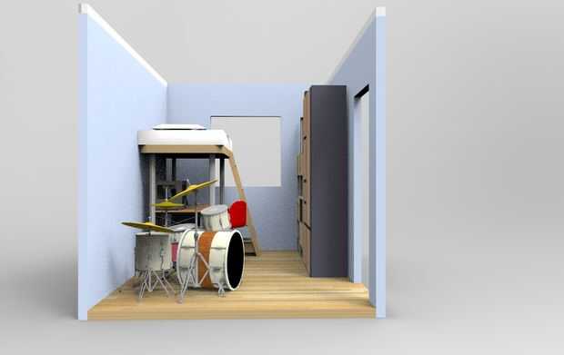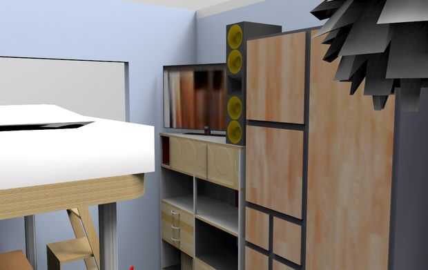 decidí diseñar un dormitorio en Google Sketchup que satisfarían la habilidad de ser un lugar entretenido, un buen lugar para relajarse, tener un lugar para trabajar y estudiar en. Cuenta con una configuración de la cama, snack-bar, estudio de escrito