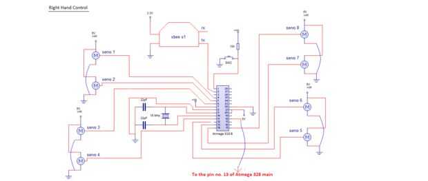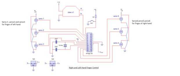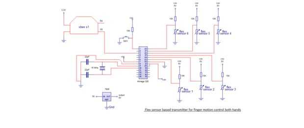 Para movimientos de dedos que hemos utilizado flex sensores que cambia su propia resistencia como doblan. Estos son sensores analógicos también. Como usuario mueve sus dedos, la flexión curvas sensores generando valores analógicos de salida. Estos valores que tenemos que convertir en digital para su posterior procesamiento. Análogo a la conversión digital se realiza mediante el uso de microcontrolador ATMega328 es decir convierte continuo diferentes valores analógicos en valores digitales entre 0 y 1023. Además de esto, ATMega328 realiza la técnica de mapeo convirtiéndola en 100 a 230 para alcanzar el tamaño de paso de 1 grado. Asignados los valores se transmiten a través de módulo de RF XBee.